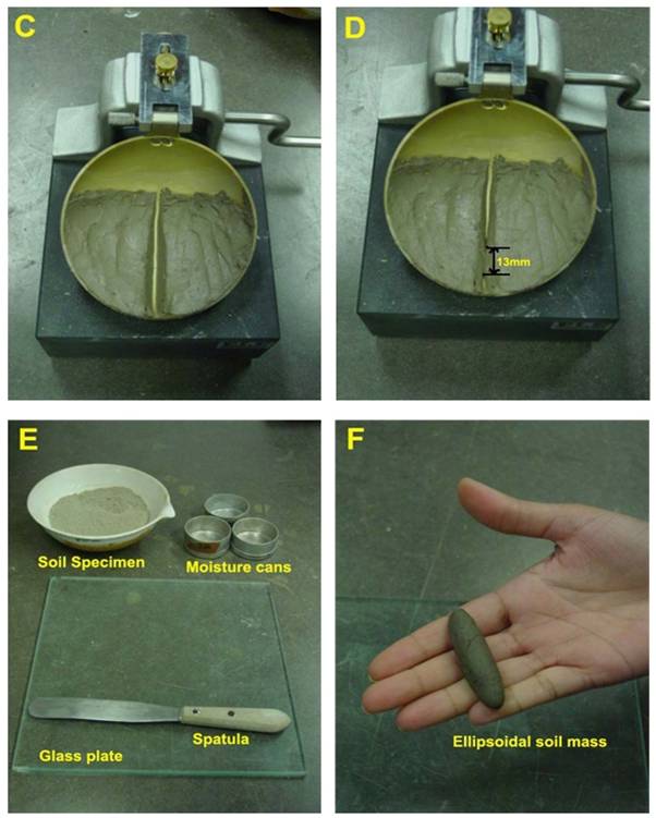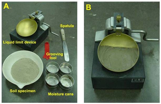 Equipment: Liquid limit device, Porcelain (evaporating) dish, Flat grooving tool with gage, Eight moisture cans, Balance, Glass plate, Spatula, Wash bottle filled with distilled water, Drying oven set at 105°C.