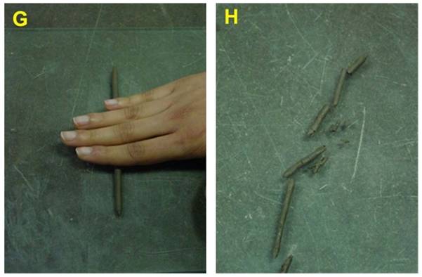 (4) When the diameter of the thread reaches the correct diameter, break the thread into several pieces. Knead and reform the pieces into ellipsoidal masses and re-roll them. Continue this alternate rolling, gathering together, kneading and re-rolling until the thread crumbles under the pressure required for rolling and can no longer be rolled into a 3.2 mm diameter thread (See Photo H).