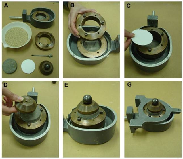 (4) Place the sand into the shear box and level off the top. Place a filter paper, a porous stone, and a top plate (with ball) on top of the sand.
