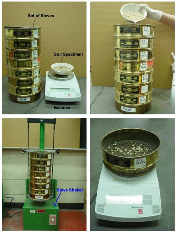 (5) Remove the stack from the shaker and carefully weigh and record the weight of each sieve with its retained soil. In addition, remember to weigh and record the weight of the bottom pan with its retained fine soil.