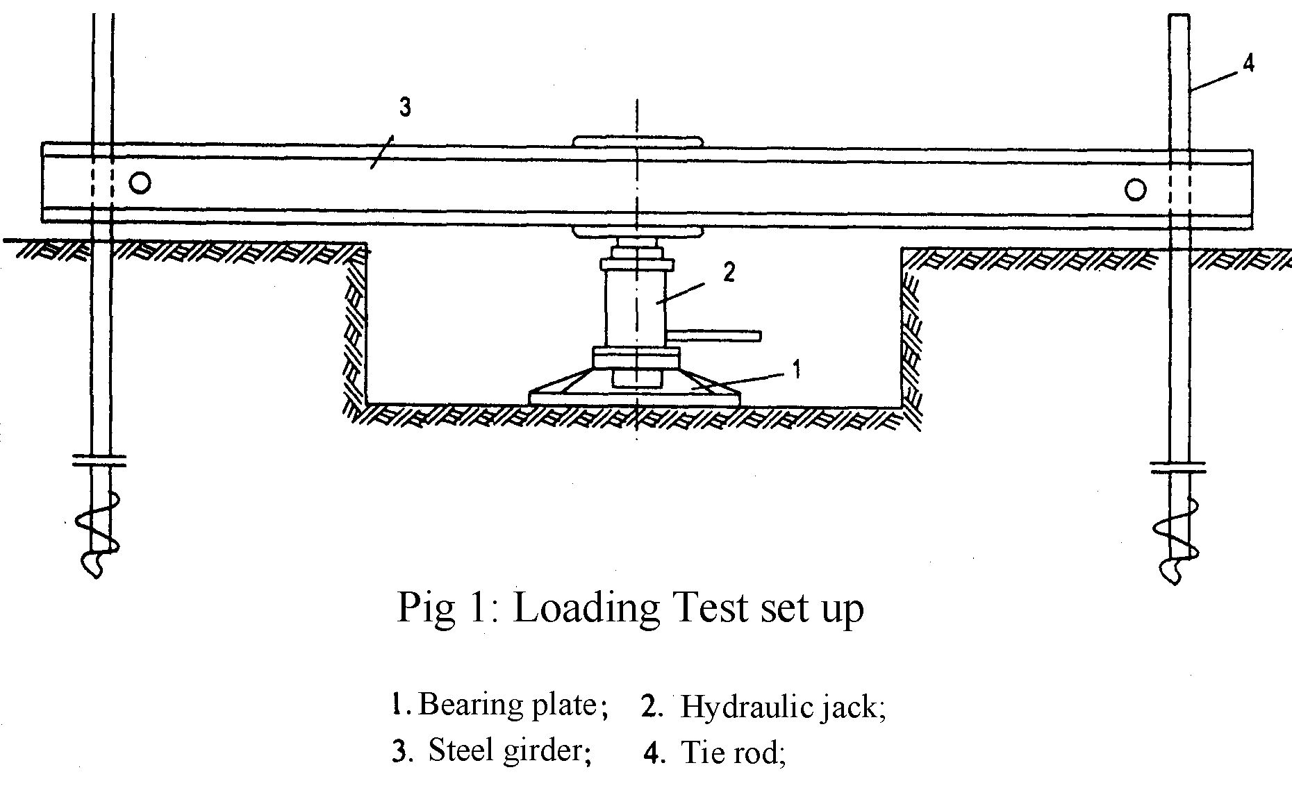 The testing was carried out on a level surface excavated in a test pit. A round steel plate was pushed into the soil. The plate was placed at the center of the hole. Load to the plate was applied in steps by means of a jack for good soil (0.0 – 0.5 – 1.0 – 1.5 – 2.0 – 2.5 – 3.0 – 3.5 – 4.0 ...kg/cm2).